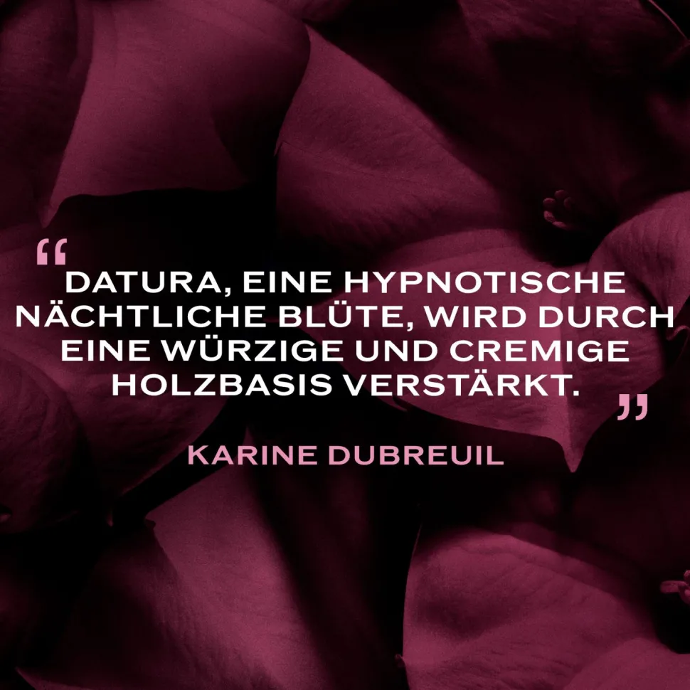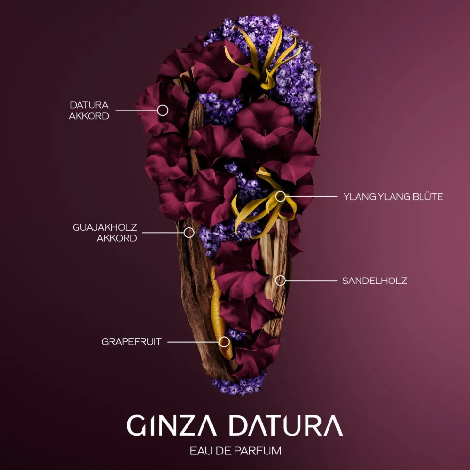 GINZA DATURA ist ein holzig-blumiger Akkord, der durch verführerische Holznoten erwärmt wird. Der Duft eröffnet mit einer spritzigen Note, in der die Frische von Grapefruit mit dem fesselnden Exotismus von Ylang-Ylang verschmilzt. Im Herzen des Duftes liegt ein Nachhall, inspiriert von der Datura-Blume, einer rätselhaften Blüte, die sich nur bei Einbruch der Nacht öffnet. Ein warmes und holziges Herz wird durch einen Akkord aus Guajakholz und ätherischem Sandelholzöl enthüllt, wodurch ein Parfum entsteht, das so kostbar wie geheimnisvoll ist. Dieses Parfum ist vegan zertifiziert und 90 % seiner Inhaltsstoffe sind natürlichen Ursprungs. Der verwendete Alkohol wird aus Roter Bete gewonnen, einer natürlichen Quelle, die in Frankreich angebaut wird. Die Formel ist dermatologisch getestet.